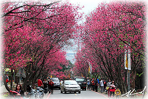 復興三路這一小段櫻花是屬於台灣緋寒櫻,但開花似乎比其他地方緋寒櫻稍晚,不過由於開花期接近,故可以欣賞到少見的櫻花滿開街景.